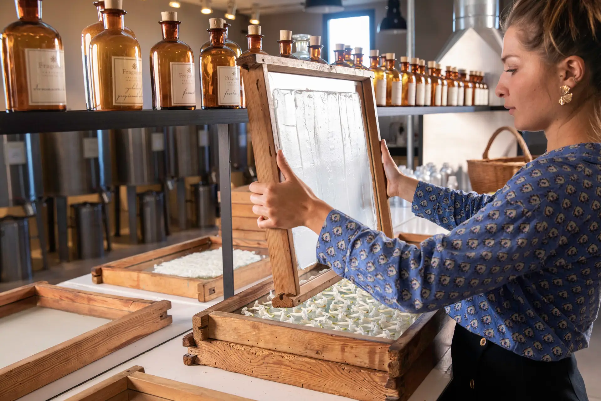À quelques minutes du centre-ville, le site de Fabrique des Fleurs incarne la modernité de Fragonard. Dans un cadre lumineux et contemporain, vous découvrez les étapes actuelles de production :